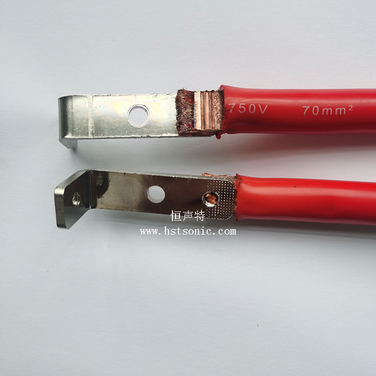 70平方電纜線與鍍鎳銅片超聲波焊接機焊接效果牢固,表面痕跡齒形均勻,無毛刺。