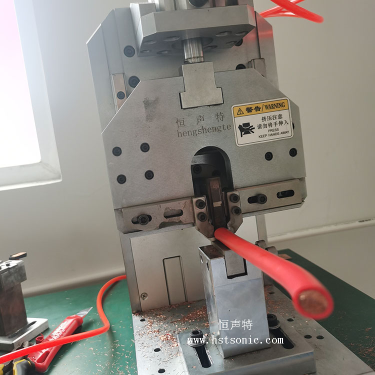 超聲波金屬焊接機設備操作簡單,將銅片放在下工裝處,在將電纜線放在銅片上面,定位,啟動按鈕,設備在設定好的參數下完成壓接。